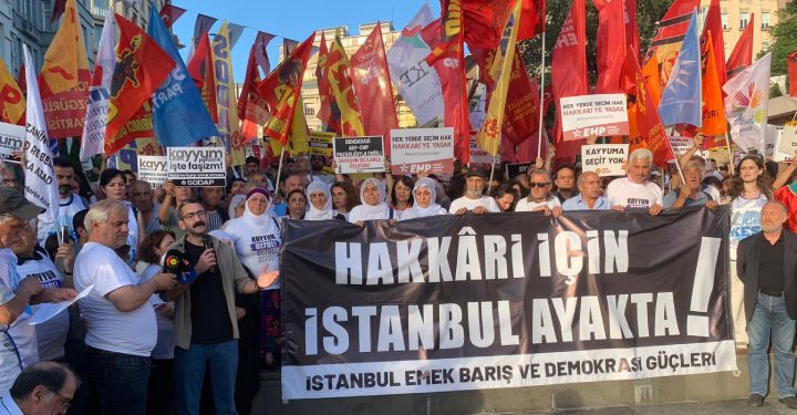 İstanbul Emek, Barış ve Demokrasi Güçleri, Hakkari (Colemêrg) Belediyesi’ne kayyım atanmasına karşı Beyoğlu’nda bulunan Şişhane Meydanı’nda “Adalet...