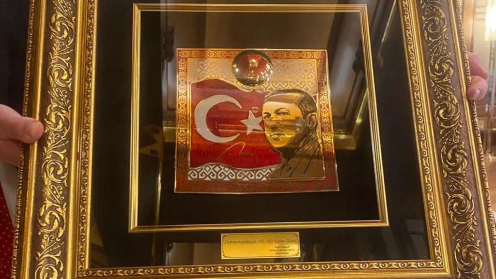 Milliyetçi Hareket Partisi Genel Başkanı Devlet Bahçeli, Cumhuriyet Bayramı dolayısıyla Cumhurbaşkanı Recep Tayyip Erdoğan’a özel bir hediye gönderdi. Bahçeli’nin Erdoğan’a gönderdiği tabloda, “Cumhuriyetimizin 102. yılı kutlu olsun” mesajı, Erdoğan’ın resmi ve imzasının Türk bayrağı ile Cumhurbaşkanlığı forsuyla bir arada yer aldığı bir tasarımla belirtildi.