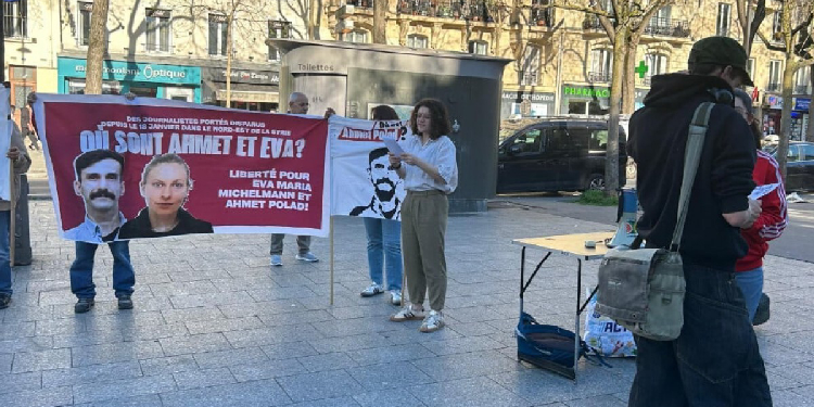 Fransa’nın başkenti Paris’te “Eva ve Ehmed Nerede? İnisiyatifi”, Reqa’da 18 Ocak’ta kaçırılan gazeteciler Eva Maria Michelmann ve Ehmed Polat için eylem düzenledi. Paris’in Menilmontant metro istasyonu önünde stant açan inisiyatif, bildiri dağıtımı ve konuşmalarla kamuoyunu bilgilendirdi. HTŞ, DAİŞ ve Türkiye destekli paramiliter grupların Kuzey ve Doğu Suriye Özerk Yönetimi bölgesine yönelik saldırıları sırasında Reqa’da bulunan gazetecilerden 18 Ocak’tan bu yana haber alınamadığı belirtilirken, inisiyatifin her hafta düzenli eylemlerle gazetecilerin akıbetini gündeme getirdiği ifade edildi.